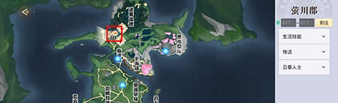 玩家首先需要来到这个萤川郡,然后直接来到地图上面,然后在如图所示的位置,就是813.917这里,就可以来到这个伐木场了,玩家还可以学习这个伐木的技能。