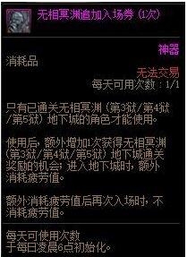使用后,额外增加1次获得无相冥渊(第3狱/第4狱/第5狱)地下城通关奖励的机会;进入地下城时,额外消耗疲劳值。