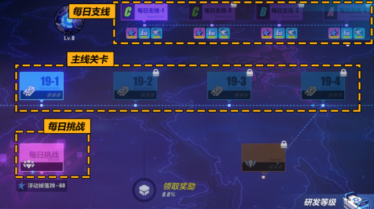 主线十九章共分为三个战区,每个战区都由三个部分组成:分别为主线剧情关卡、每日支线关卡及每日挑战关卡。