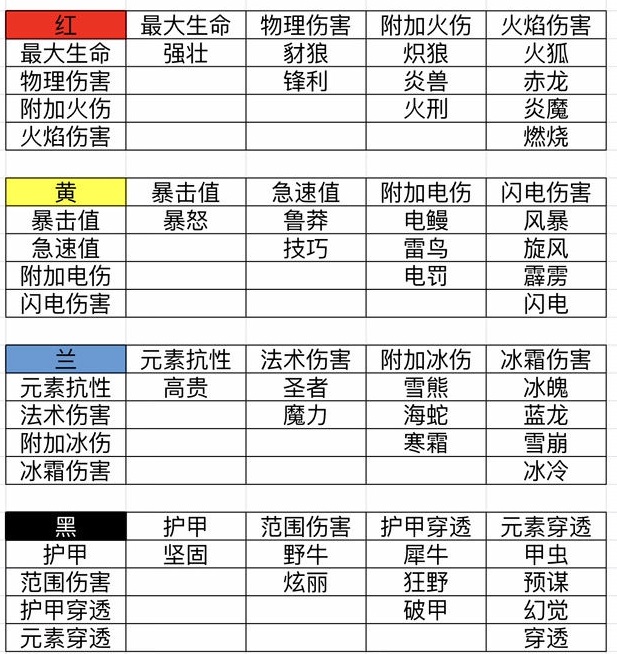 3、属性优先级,比如你既需要黑色的范围伤害也需要黑色的法术穿透,那么选择预谋(范围加法穿)加的属性和要高于炫丽(单范围)或者穿透(单法穿)这种单个属性模块的属性。具体数据大约为1.33倍,取舍根据不同职业有所不同,根据下图表一,如果你需要同种颜色两种属性,选择双属性“之”模块,如果只需要一种属性,选择单属性“之”模块。