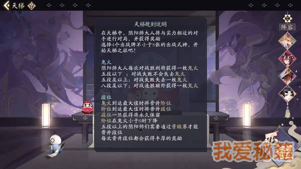 在天梯中,阴阳师大人将与实力相近的对手进行对局,并获得奖励。选择4个出战牌不小于8张的出战式神,开始天梯之旅吧!