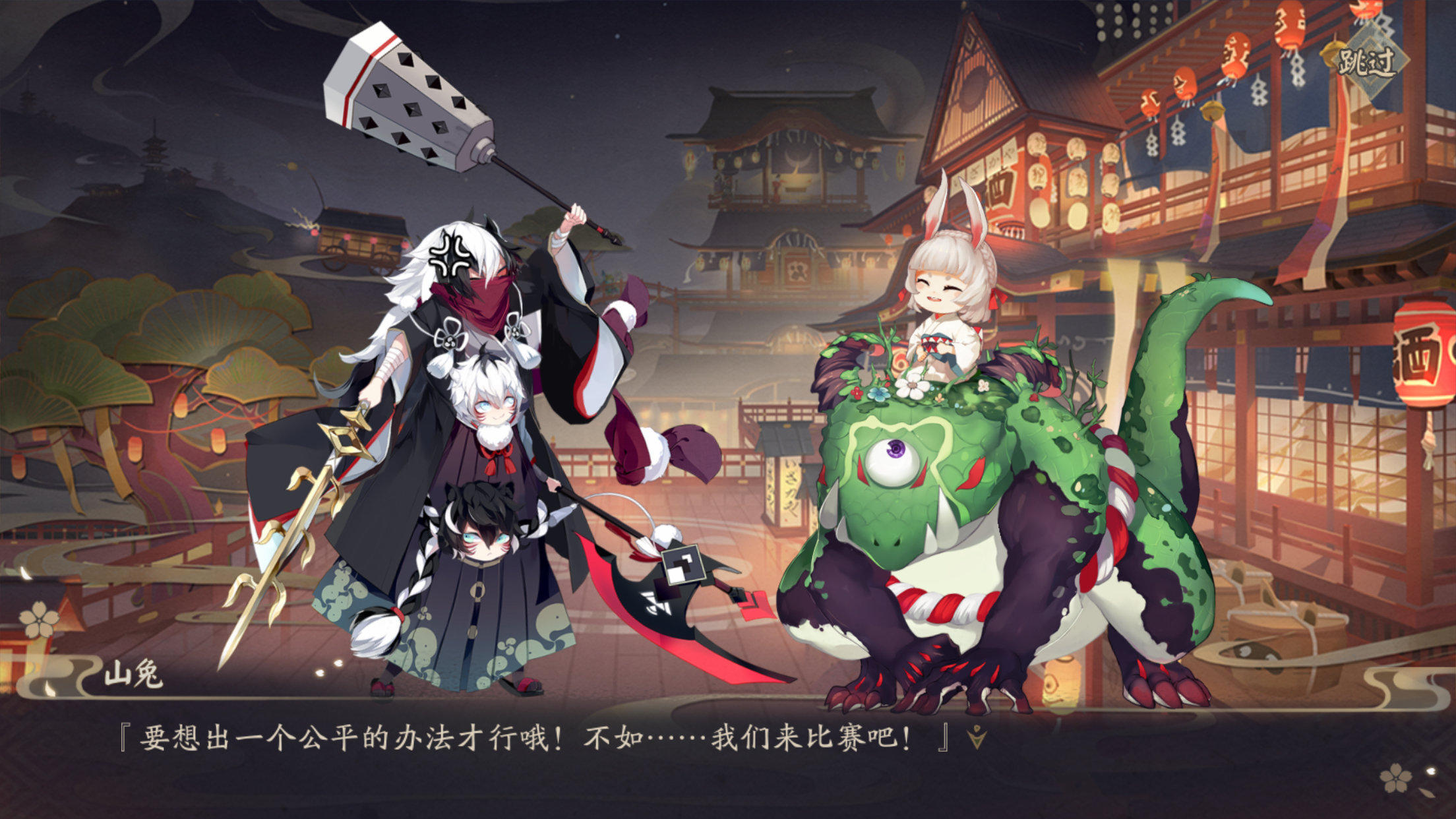 进入游戏后,萌萌的山兔和身着"萌鼬童心"皮肤的镰鼬几番言语争锋,迅速将玩家代入场景。伴随着对蜃气楼"邀请函"的争夺,引导对局随即开始~