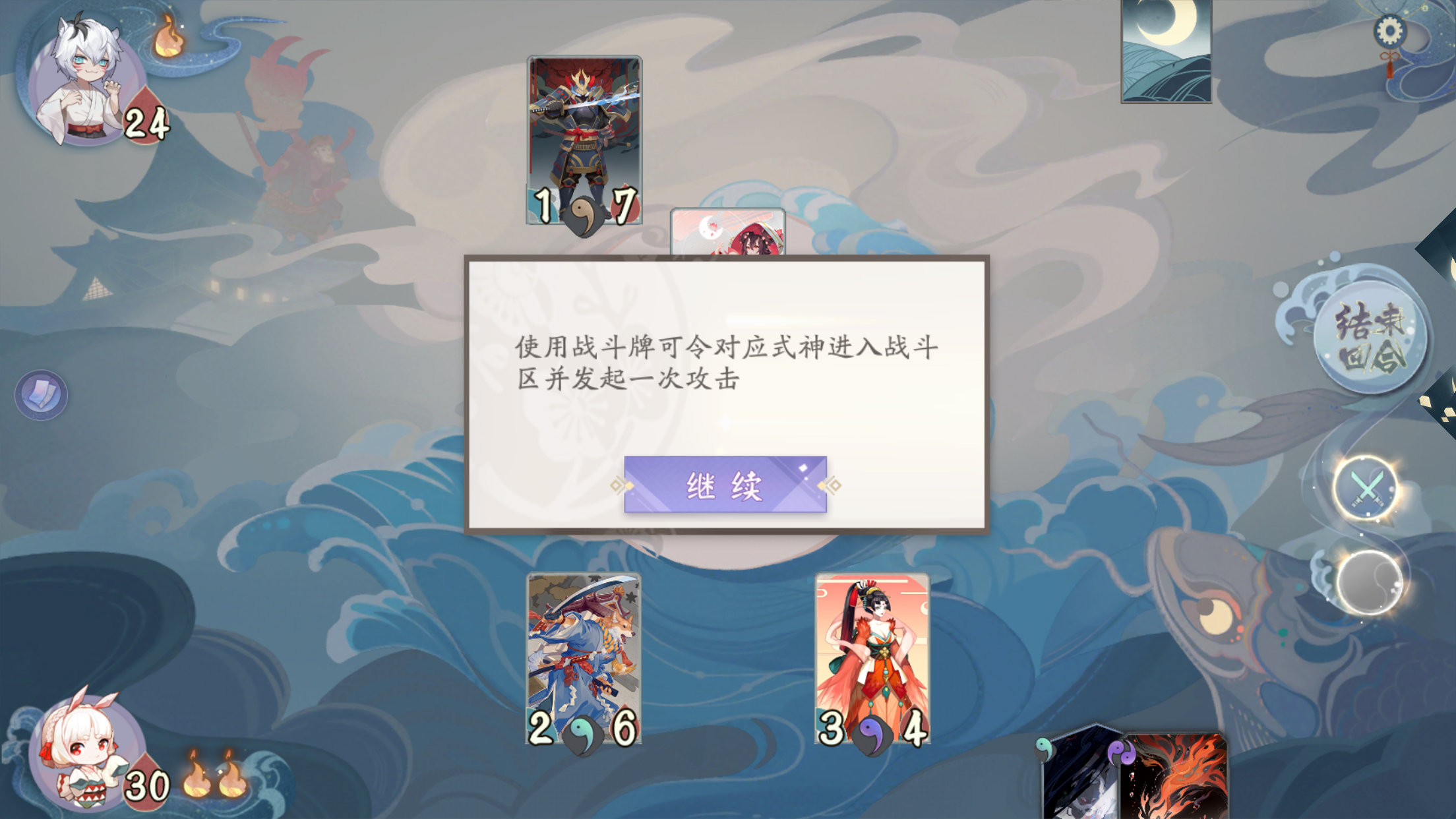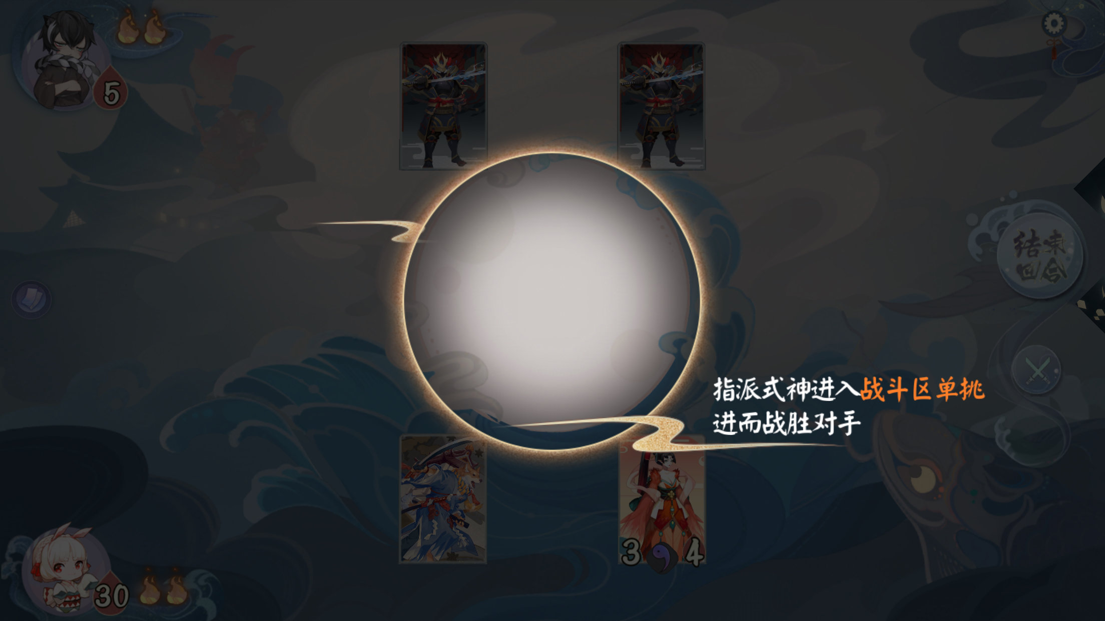 至此我们总结一下战斗流程:手牌发放—分配升级—指派出战(打出手牌—式神对决)-结束回合