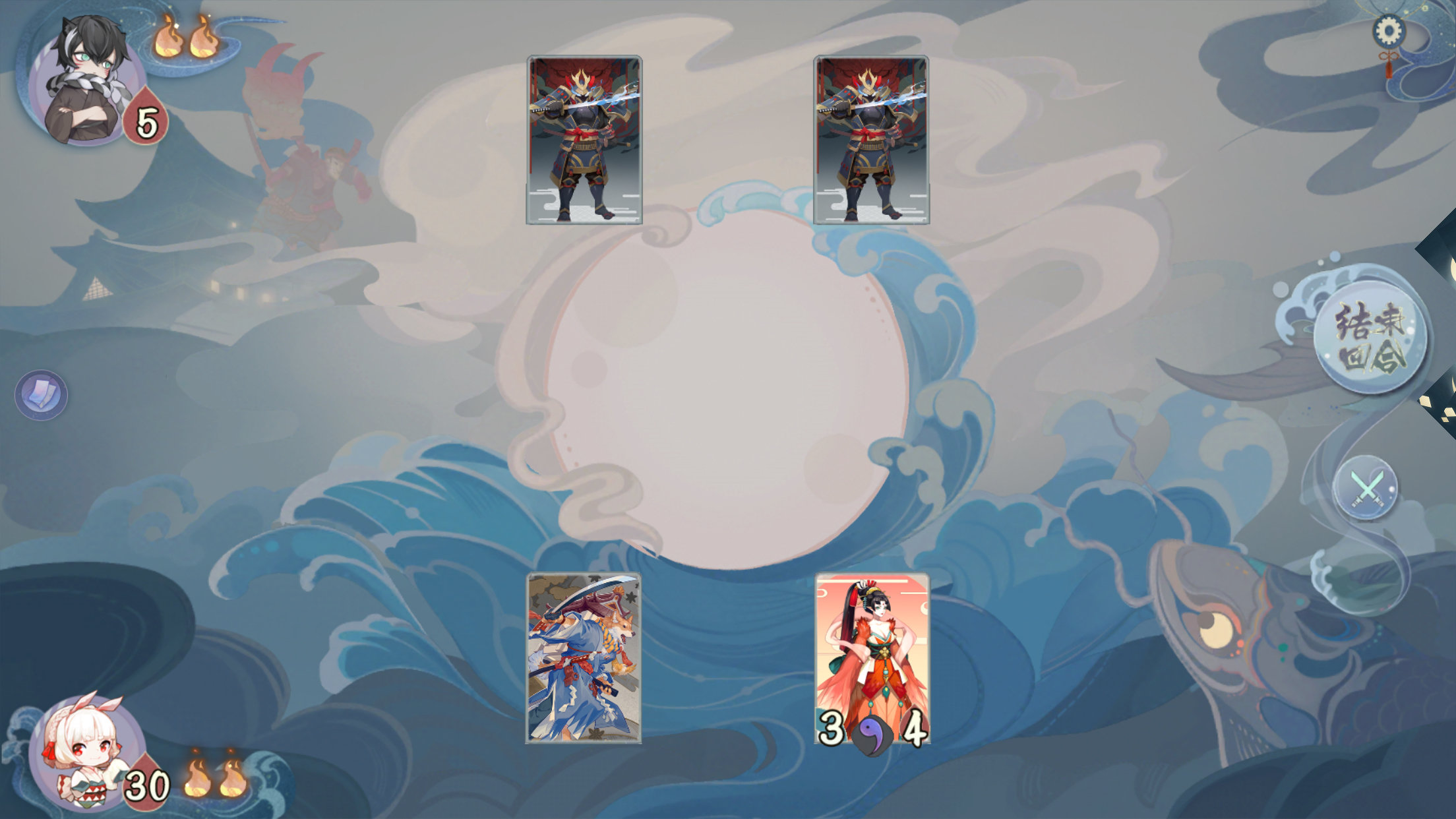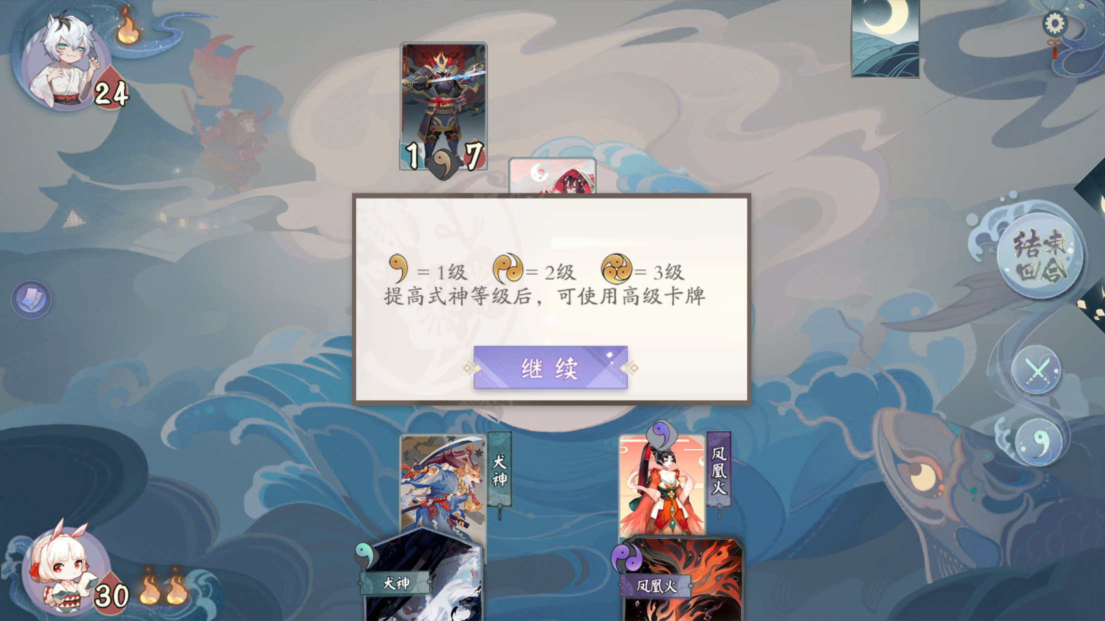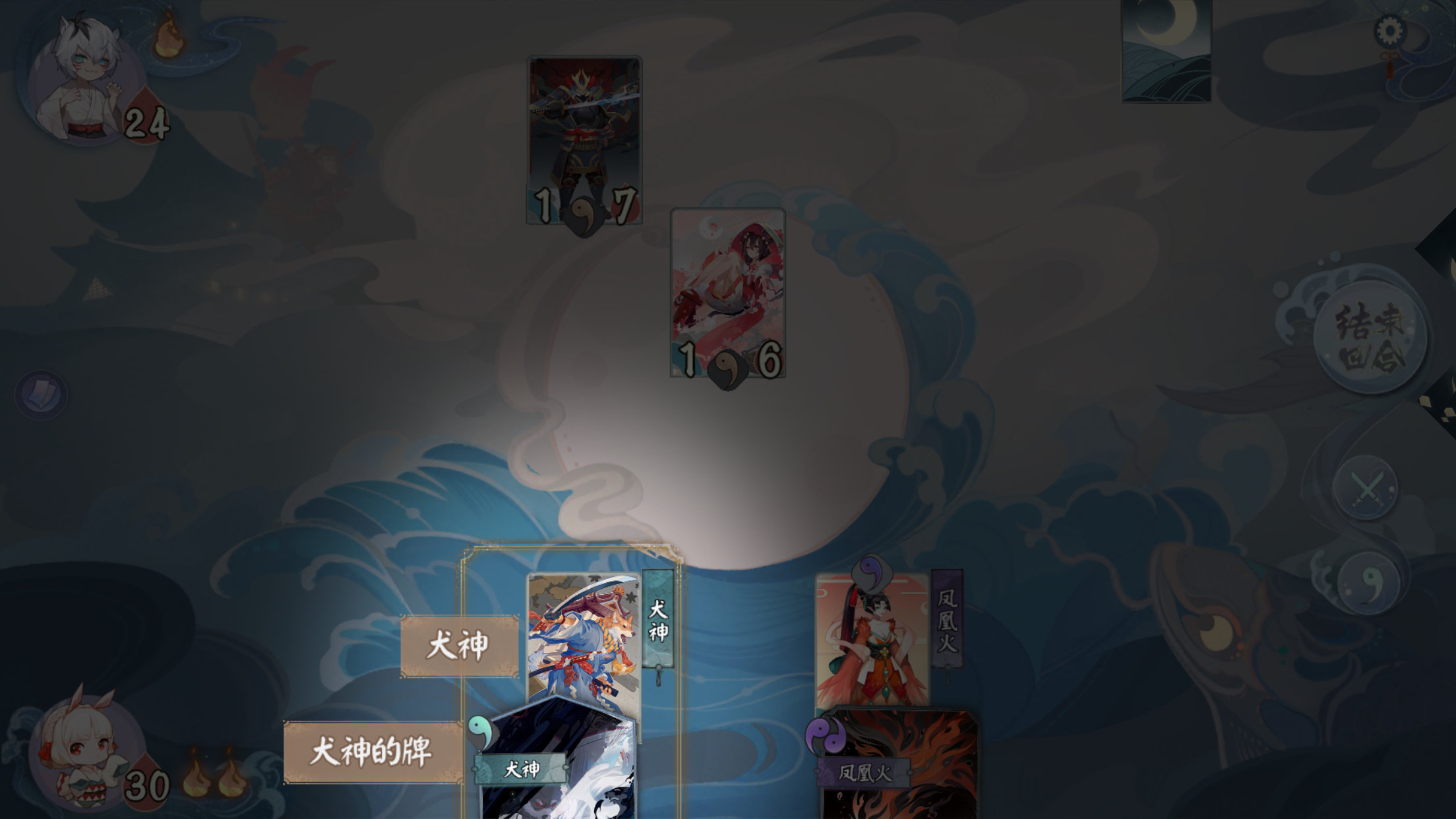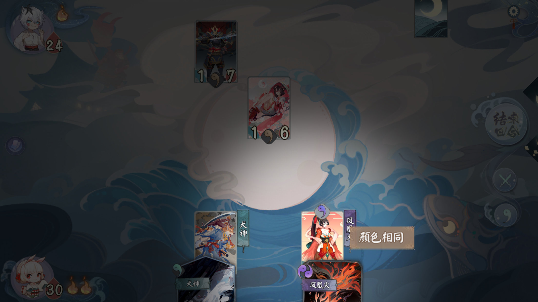 至此我们总结一下战斗流程:手牌发放—分配升级—指派出战(鬼火限制:打出手牌—式神对决)-结束回合