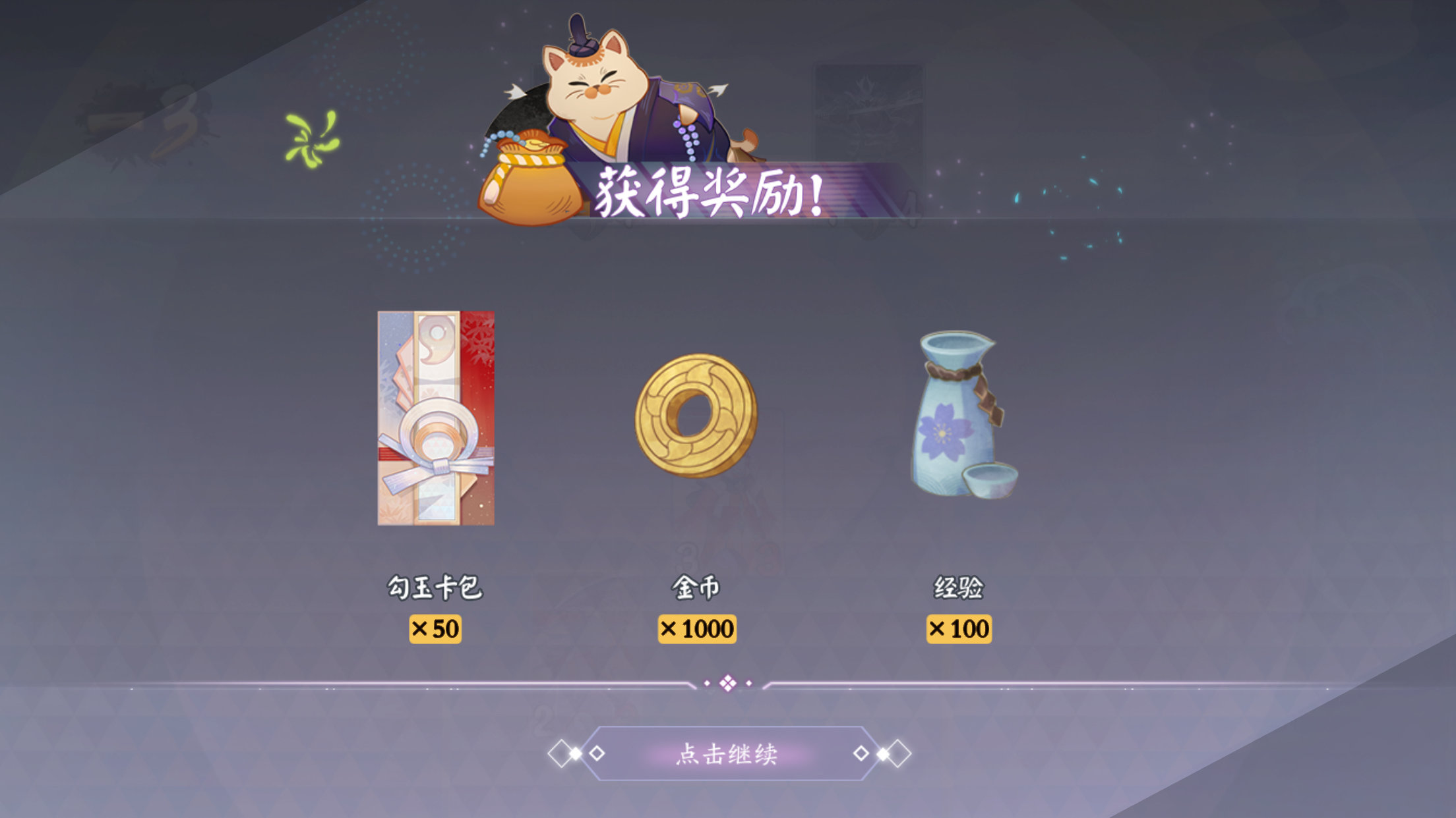 在剧情引导对局中,战斗奖励包括勾玉卡包*50(勾玉卡包:可召唤高稀有度卡牌),金币*1000(金币:通用货币),经验*100(经验:用于人物升级的资源)
