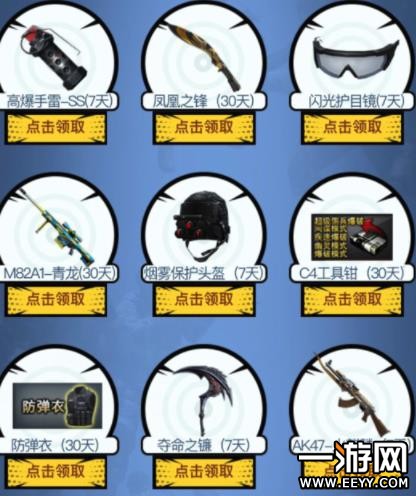 幸运用户可以任意选择【四个道具领取】,每个道具只可以领取一次!奖励有:高爆手雷SS(7天)、凤凰之锋(30天)、闪光护目镜(7天)、M82A1-青龙(30天)、 烟雾保护头盔(7天)、C4工具钳(30天)、防弹衣(30天)、幽灵之刃(7天)、AK47-火麒麟(7天)