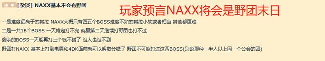 所以未来的野团也许对NAXX这个团本真的会非常绝望,因为既要找到熟悉BOSS拉法的T,还要找到能看好T的治疗,而且更重要的是全团还必须要能够有良好的团队跑位和对于突发情况的处理。总的来说,光是组人可能野团都会非常难。如果暴雪这一次不削弱,那么NAXX还真就要成“野团末日”了!