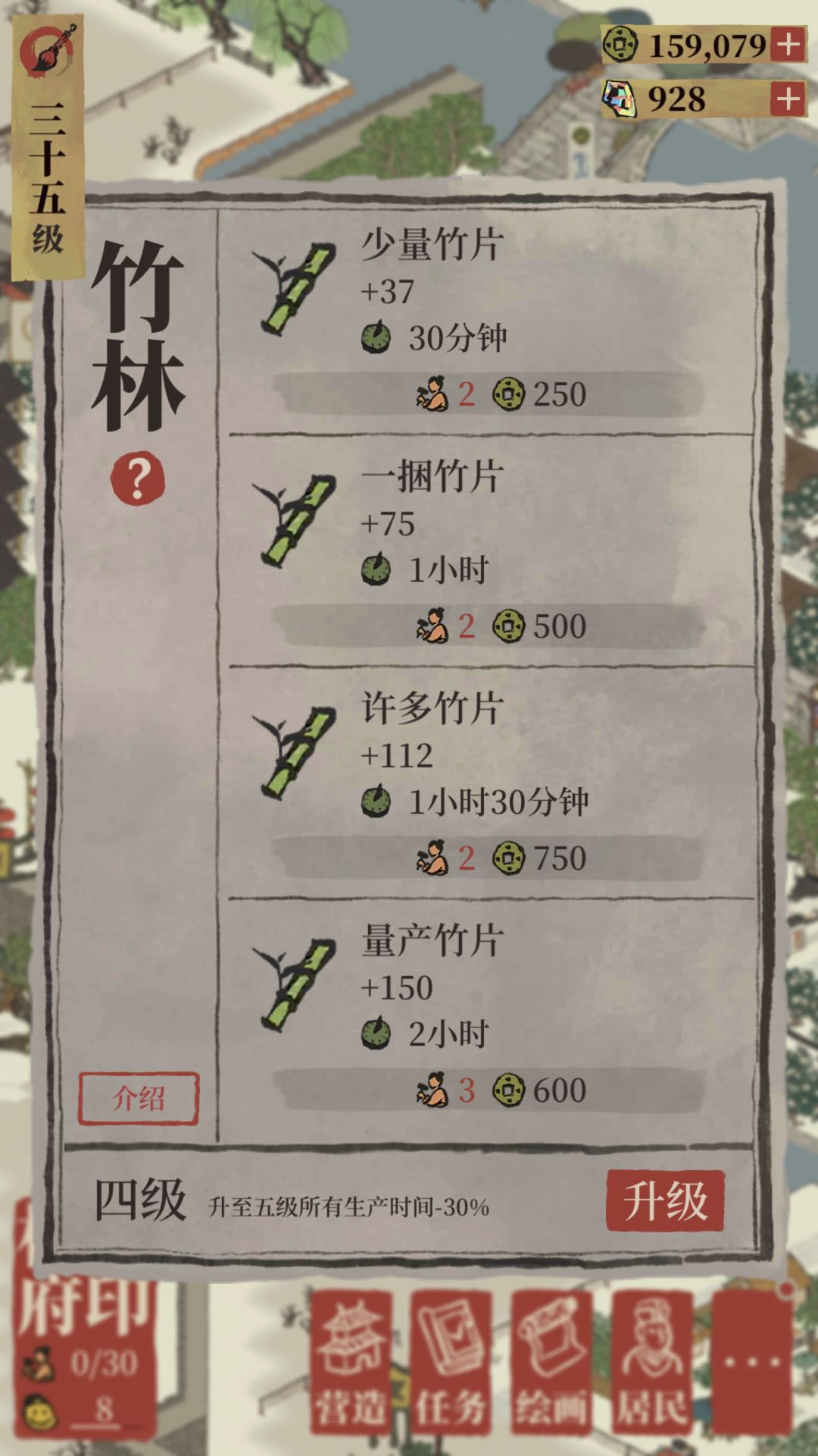 两天之前,我有21片竹林,使用第一档生产,半个小时一轮,基本上平均生产三轮会爆两个竹笋,大概就是生产30次会爆一个竹笋。经过几天努力我大概爆了33个竹笋,每种竹笋建筑都买了一个,又用米市巷绣球建了一条街。