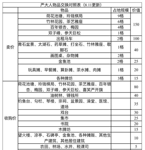 小技巧:有江湖消息称,严大人在多年的买卖生涯中,形成了自己独有的一套价值交换体系。(以告示牌为例,在严大人的眼中,价值为1,竹林花园价值为150,虽然严大人对于告示牌很是不屑,但如果我们凑够150个告示牌也不是不能商量的)。