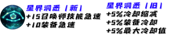 现在的星界洞悉相比以前,没有太大的改变!没有了最大冷却值,但是现在版本冷却缩减(技能急速)已经没有上限了,属性上前期星界洞悉提供的冷却收益要高于老版本的!