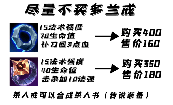 碰到对线能力比较强的英雄时候可以选择多兰盾,拥有续航能够更好对线!