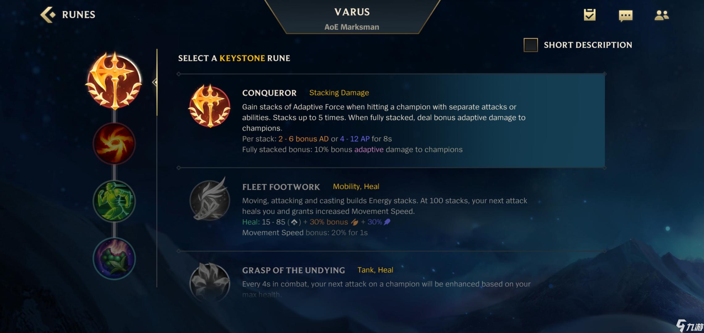 英雄联盟手游的天赋采用1+3模式,即一个主系三个副系。主系小编推荐大家携带征服者,因为征服者能够让前期的韦鲁斯有更好的输出能力,把三技能的伤害抬得更高。