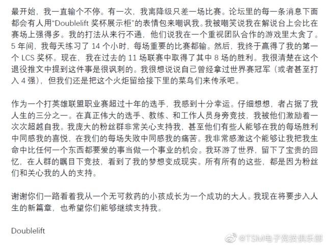 而Doublelift在退役长文中提到,他从一开始的不自信、害羞、健忘,一直到遇到英雄联盟,让自己变得勇敢、自信、受欢迎。而英雄联盟也成为了Doublelift唯一了解的表达方式,用英雄联盟,Doublelift成功表达了自己,而英雄联盟也塑造了如今的Doublelift!