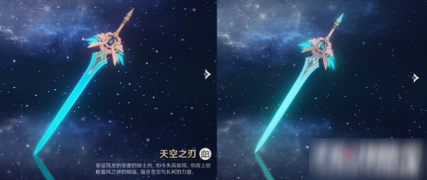 天空系列武器,突破后色彩变得更加明亮,熠熠流光,剑刃和剑柄的颜色都升华为如天空般存粹洁净的蔚蓝,更加凸显出其“天空”之名。