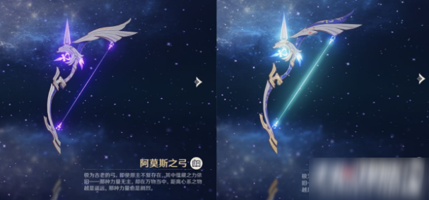 阿莫斯之弓应该是突破后变化最大的,突破后整体色调由紫色化为蓝色,弓上的花纹也更加突出,色彩更分明。从原来的神秘感变得更显惊艳,结合简介更有种在痛苦中寻觅光明的蜕变之感。