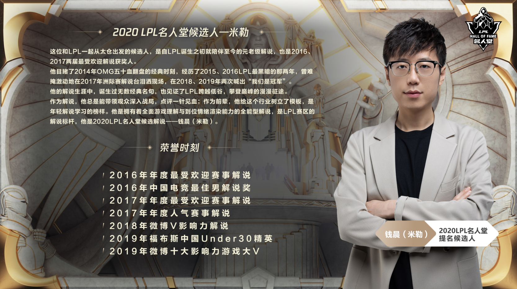作为解说,他总是能带领观众深入战局,点评一针见血;作为前辈,他给这个行业树立了模板,是年轻解说学习的榜样。他是拥有着全面游戏理解与到位情绪渲染能力的全能型解说,是LPL赛区的解说标杆,他是2020LPL名人堂候选解说——钱晨(米勒)。