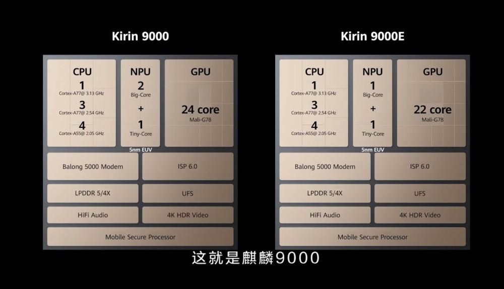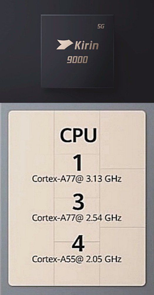 CPU部分:麒麟9000芯片是迄今为止性能和能效最出众的手机麒麟芯片,采用1个超大核+3个大核+4个小核的三档能效架构,最高主频可达3.13GHz。