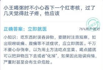 小王喝粥时不小心吞下一个红枣核,过了几天觉得肚子疼,他应该怎么办?总所周知,红枣核是不会被身体所消化的那么如果一不小心误吞了红枣核该怎么办呢?这不在2020年12月4日支付宝蚂蚁庄园答题中就有一道关于误吞红枣核的题目“王喝粥时不小心吞下一个红枣核,过了几天觉得肚子疼,他应该”,那么大家知道答案是什么吗?今天小编就为大家介绍一下,希望能够帮到各位哦。