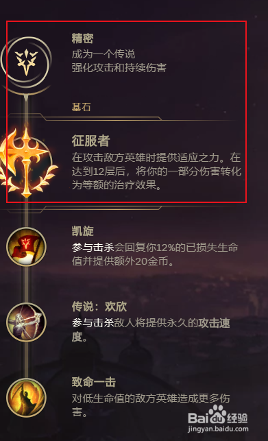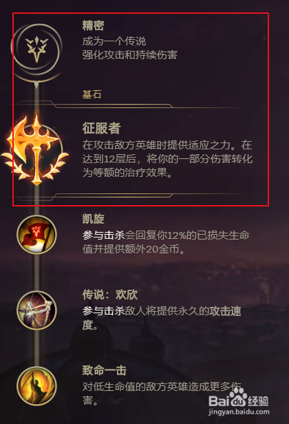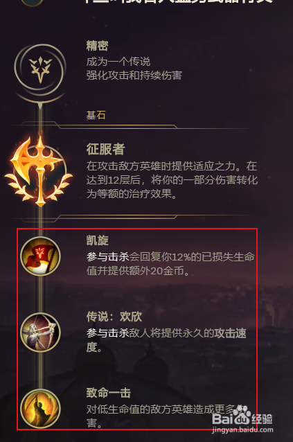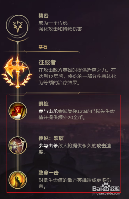 主系小符文选择凯旋,传说欢欣和致命一击。