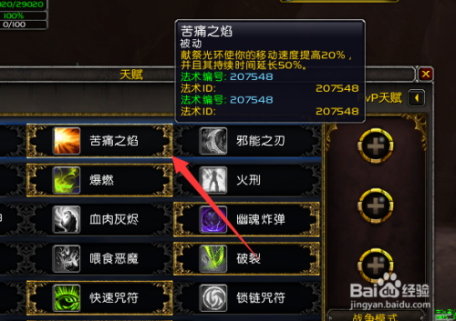 我们第一层天赋点击苦痛之焰,献祭光环有一个本质的提升,不仅仅时间延长了,而且还能提升你的速度。
