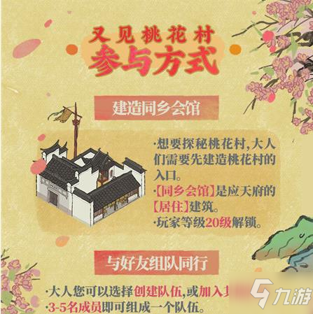 想要探秘桃花村,大人们需要先建造桃花村的入口!同乡会馆】是应天府的【居住]建筑!玩家等级20级解锁