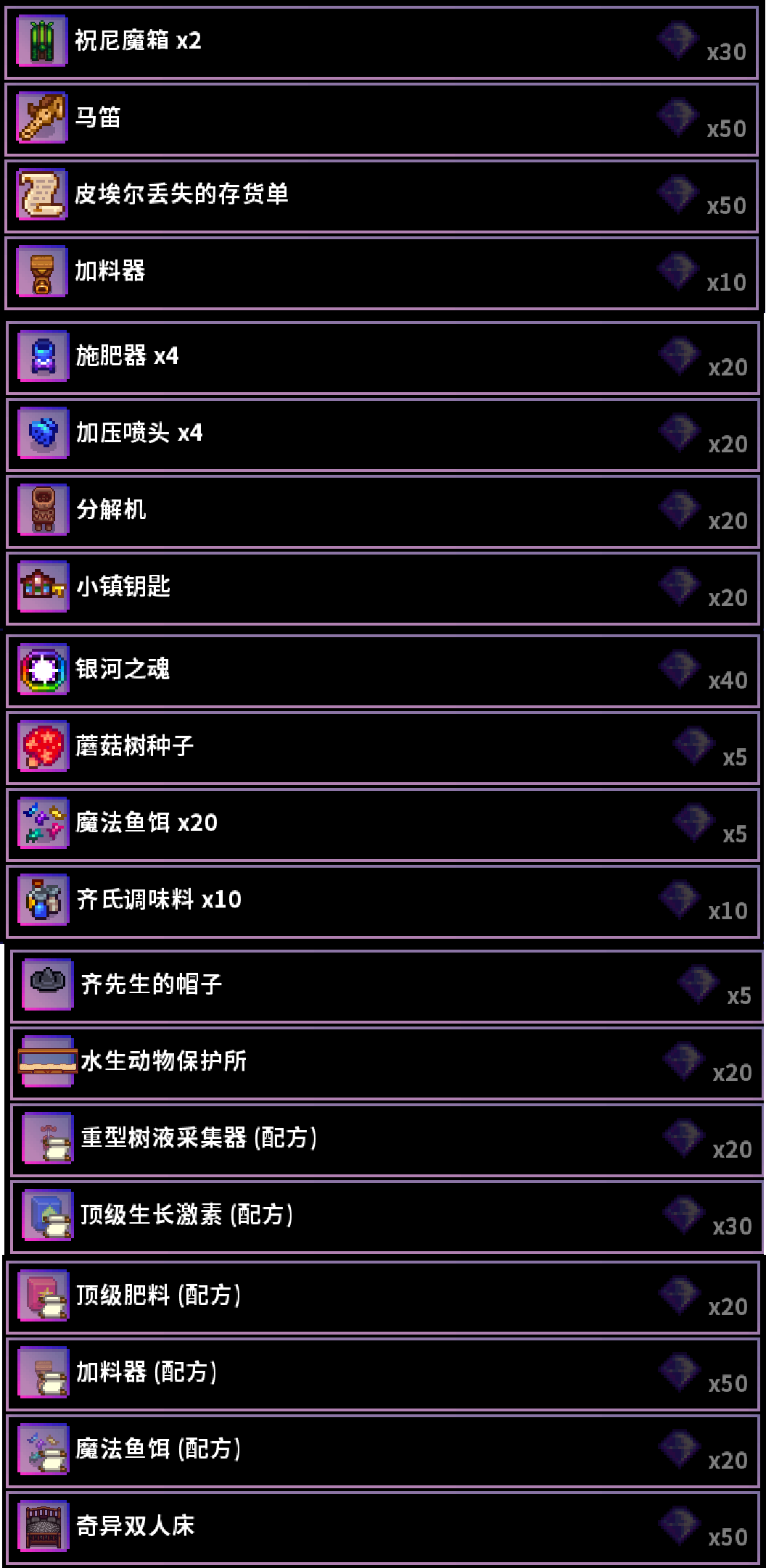 在星露谷物语1.5当中,玩家可以通过完成齐先生的特殊任务,来得到特殊物品奖励——齐钻,一定数量的齐钻可以换取许多有用的道具,那么具体可以用齐钻兑换到什么道具呢,下面就由小编来给你介绍一下吧。