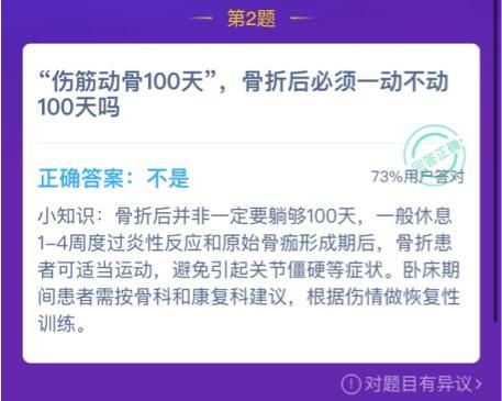 我们经常会在日常的生活中听到前辈们说伤筋动骨100天的口头禅!根据字面上的意思理解就是:万一不慎伤到了骨头,需要至少100天的时间才可以恢复,但是真的是这样吗?2021年01月07日支付宝蚂蚁庄园最新的课堂知识中的其中一道问题就是围绕骨骼小知识而展开提问的!问题是:“伤筋动骨100天”,骨折后必须一动不动100天吗?接下来小编就为大家带来这道题目的详细解答,还不清楚的小伙伴们赶紧跟随小编的脚步一起来看看吧!