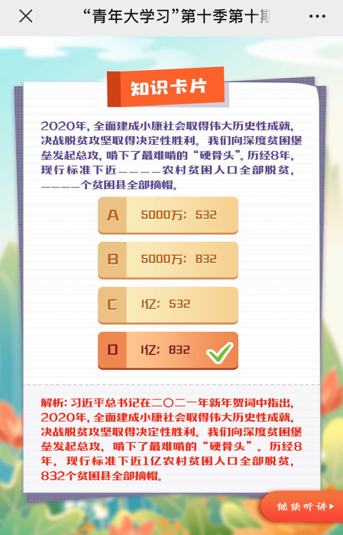 全面建成小康社会是我国国内始终坚持发展的一项重要的目标之一!在党中央的英明带领之下,我国很多地区已经实现了脱贫的现状!在今天的第一题知识卡片问题之中,就跟这一目标相关... ...很多小伙伴们都想知道答案,下面就一起来看看答案吧!