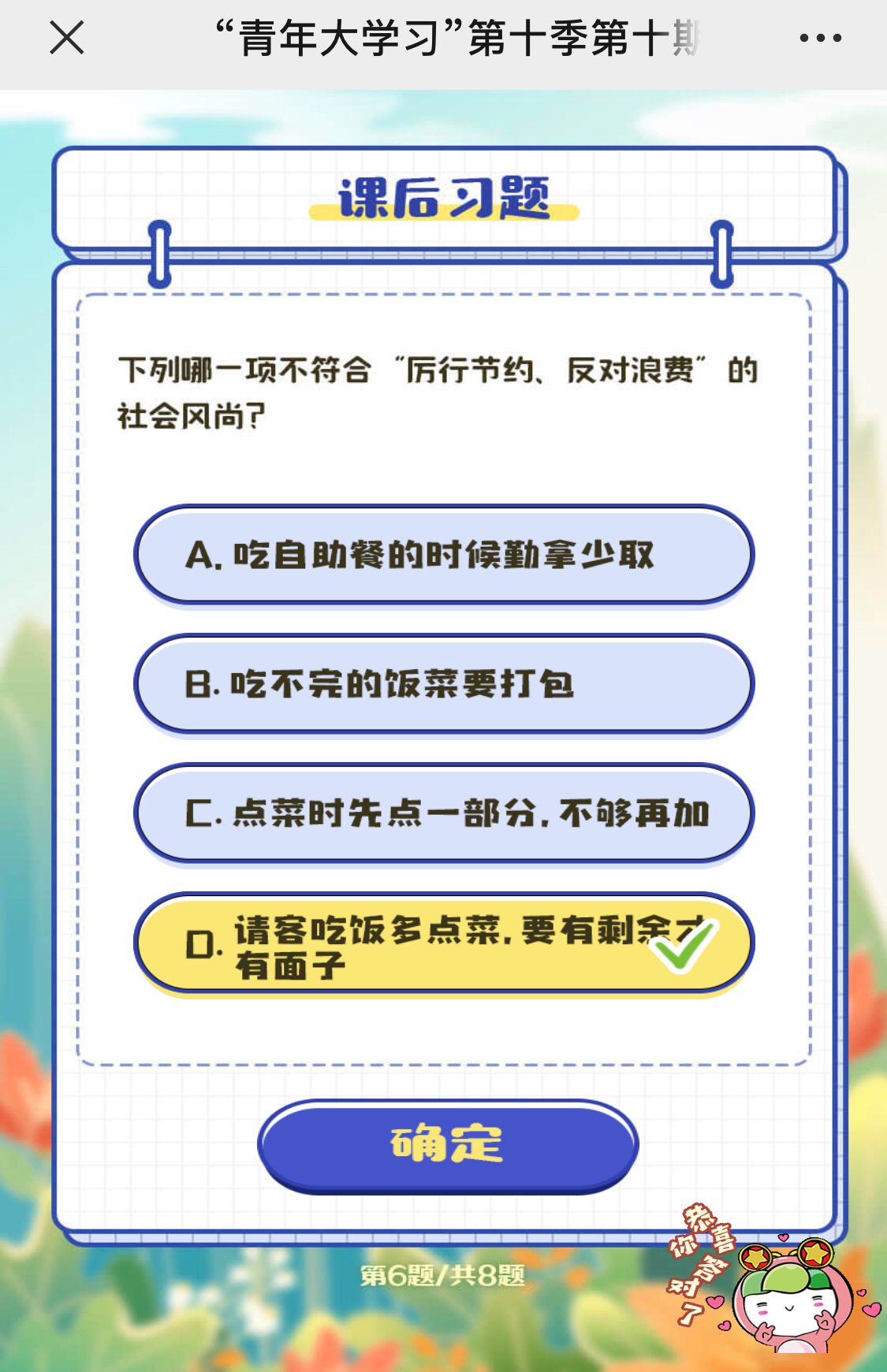 什么行为不符合“厉行节约、反对浪费”的社会风尚?这是青年大学习第十季第十期课后练习第6题的问题,光盘行动最近在我们生活中是非常火的一个话题,国家呼吁我们“厉行节约、反对浪费”,我们也正在重视起来。下面小编就为大家介绍一下青年大学习第十季第十期课后练习第6题答案介绍,希望大家喜欢。