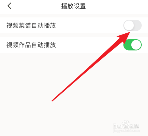 在播放设置页面,找到【视频菜谱自动播放】设置,点击关闭它,即可