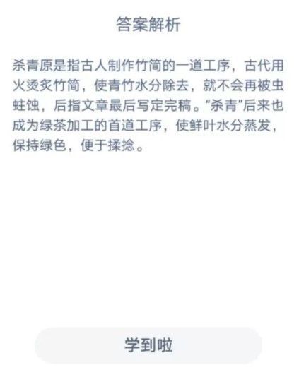 我们知道“汗青”是指古人在竹简上书写文字。先用火烤竹子除去湿,然后刮去竹子青皮部分,便于书写和防蛀,人们把这种过程称为“杀青”。