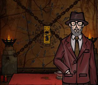 7、回到最主要的房间使用火折子烧掉墙上的符纸,之后墙上出现符号,根据在红色桌布左下角的提示,还有在火折子上面的图案提示。最后一个提示的图案就在被啃食的衣服旁边。全部填上之后,墙上面就会出现一朵食人花。