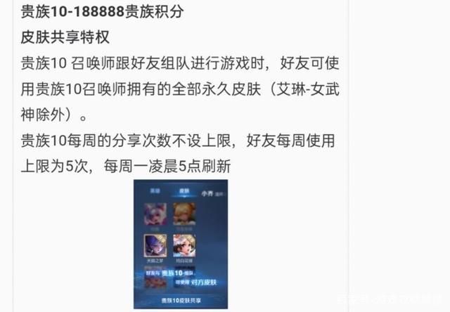 王者荣耀v10玩家的永久皮肤可以和好友共享使用,每周每个好友最多能共享5次,典藏皮肤也能共享,只有艾琳绝版皮肤无法共享使用!