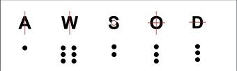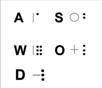 再次观察,将单个图案拆开看,发现图案呈左右两部分结构,左侧或为横,或为竖,或为横竖(十字),或为空心圆,右侧皆为小型圆点。“A”“W”极其相似,只是右侧小圆点数不一,由此推出,右侧小圆点为计数区分,左侧是规则。