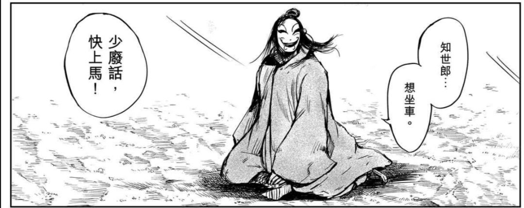 这样一位被认为是孱弱的智者,在漫画中却被许先哲表现的非常鲜活。比如在刀马初见竖要去帮忙打架时,明明该充斥着紧张与危险的气氛,知世郎却依旧可以嚷嚷着说:“知世郎要坐马车”。看着刀马不理他,还可以化作无情的复读机,不停的戳着刀马的后背!