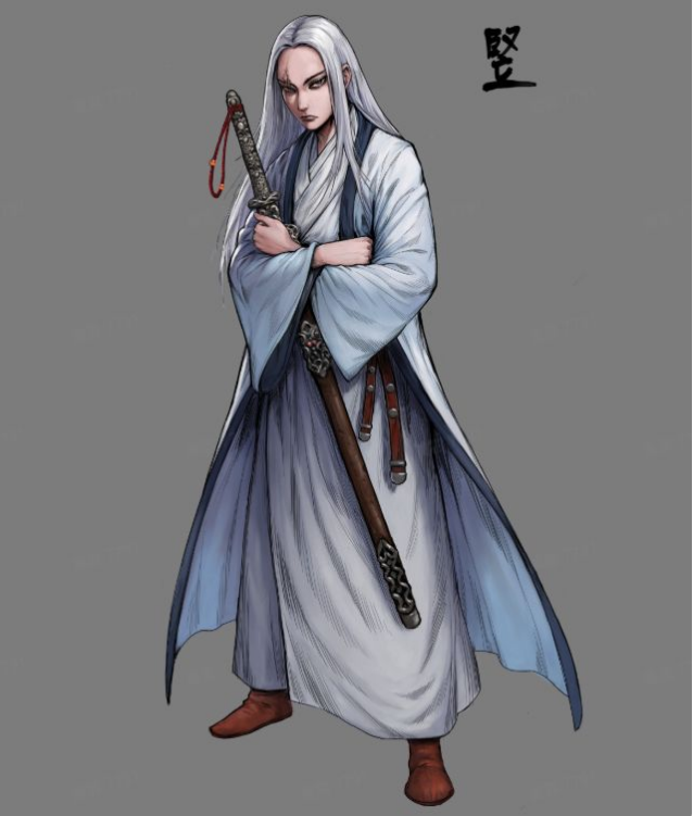 白头散发配银袍,疤脸碧眼带金刀!