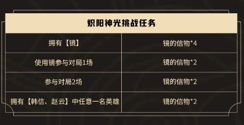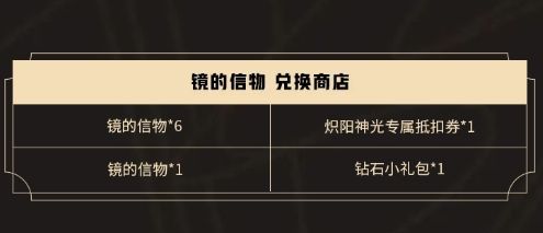 完成系列挑战任务可获得镜的信物,镜的信物可用于兑换炽阳神光专属抵扣券。