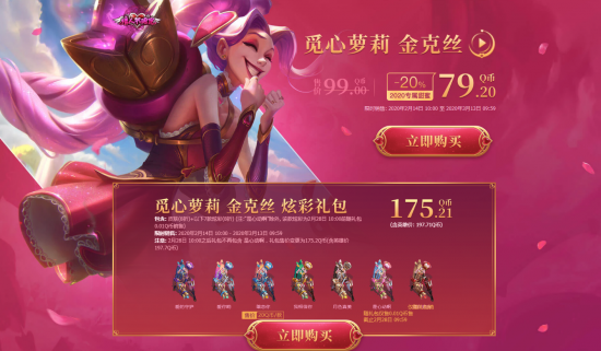 为满足不同玩家的需求,除皮肤本体外,本次上架的两款情人节限定皮肤还将以“炫彩礼包”的形式限时出售,其中“觅心萝莉 金克丝”炫彩礼包限时特惠售价为175.21Q币,礼包包含皮肤本体及7款皮肤炫彩,在2月28日之前,“是心动啊”炫彩将仅随礼包以0.01Q币价格出售。此外,“准你表白”炫彩则将仅随礼包出售!