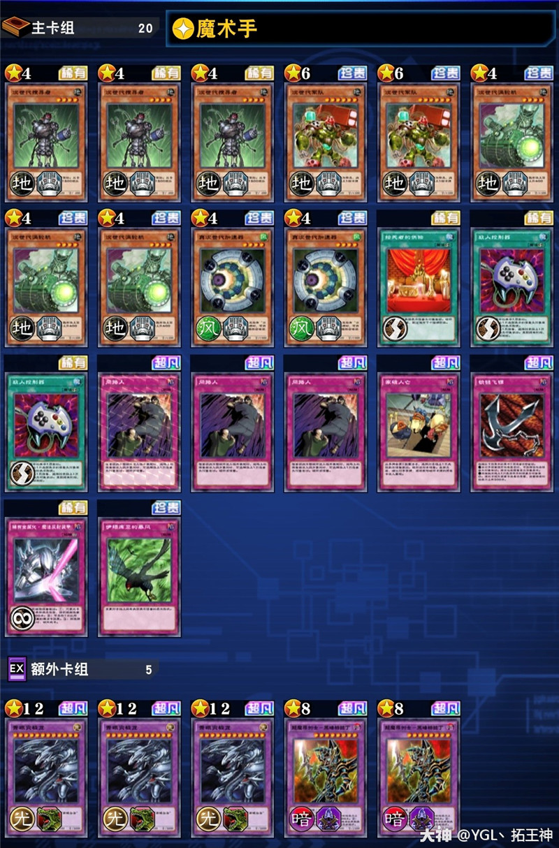 说明:【暗游戏】的【黑暗魔导师】体系不完整,部分核心卡好像在【怪物之门/排位兑换券获取】(删测本人没有核实,如有错误欢迎指出),本身【黑魔导士】卡组也未达到T0强度。