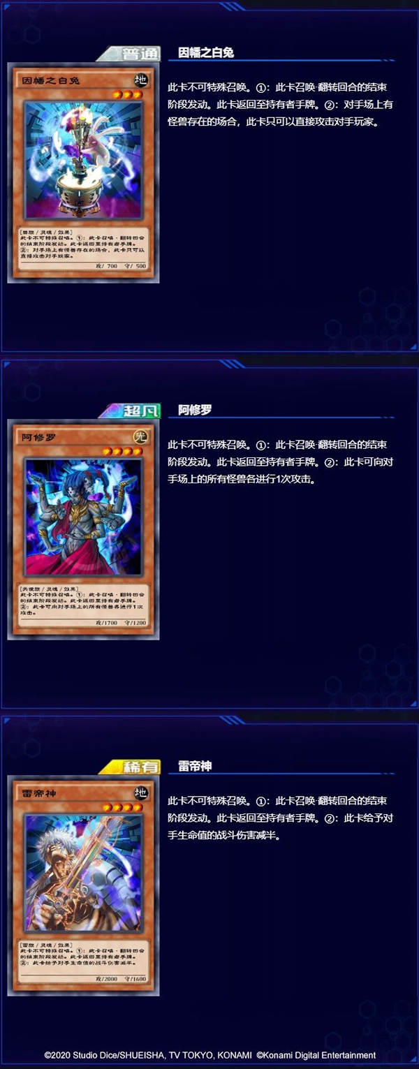 「雷帝神」等级4却拥有2000点的高攻击力,「阿修罗」可以向对方场上所有的怪兽都进行一次攻击,「因幡之白兔」在对手场上有怪兽存在时会直接攻击对方玩家。