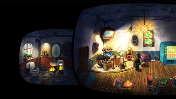 进入后,点击左边游戏机,通关小游戏,获得一个游戏币,然后投入旁边的售货机,获得香烟,然后与左下角的兔子对话,得知他要烟,于是把烟给他,然后等他点燃香烟以后,取走打火机,然后与旁边的鼓互动(小游戏),之后打鼓的兔子会给我们一个铁桶;