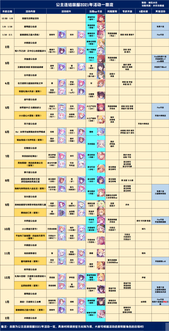 活动内容:橙色部分为复刻活动,一般在新活动结束之后复刻,在第一年没有获得部分活动限定角色的骑士君们这会就要抓紧了。