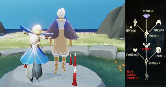 3根蜡烛兑换一个心,开两个魔法节点,合计10根蜡烛,再消耗2根暴风眼红蜡烛,兑换一个永久光之翼,然后直接用6个爱心,把二级背背动作打包带走!