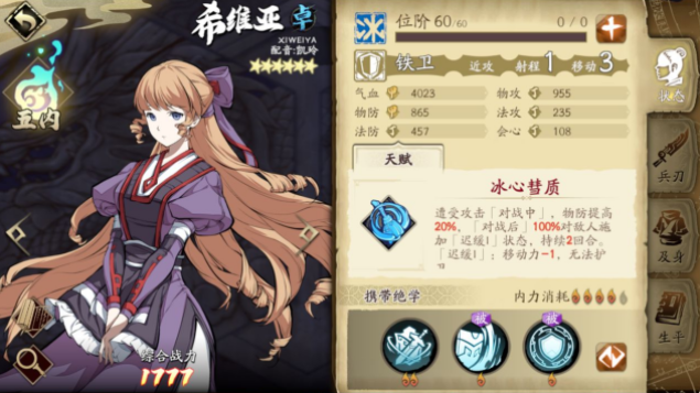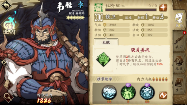 3、其他铁卫需要消耗2火的绝学韦胜作为被动全程自带,作为纯粹的肉盾相当实用,虽然基础属性稍低一些,但只要在注意属性克制的情况下就不会被秒。