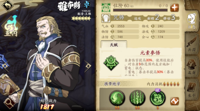 1、冰创工具人,极其好用!在没有雷属性强力输出的情况下,雅布斯是非常好的选择,利用雷引之术+合理占位,可以很好的防止自己被秒。