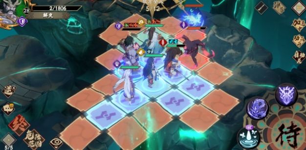 (3)第6回合杨云佐从下图位置直接给BOSS放技能,并且停在下图位置,然后解臾走进BOSS攻击范围,并且和白苑一起引出群攻技能(白苑的站位也是为了第7回合可以站在buff地块给取得buff再动的殷剑平上血刃)。韩无砂始终用单体技能或普攻,并且应该吃到血刃以最大化输出。