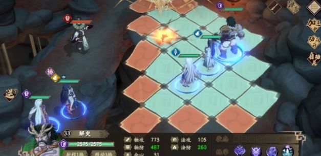 第7回合。冰璃到BOSS左2格放幽剑,韩无砂左走2格离开攻击范围,解臾被补满血之后走到BOSS下面卡位(冰璃也需要顺便被补满,防止BOSS秒杀)。敌动阶段,BOSS会对解臾放技能。
