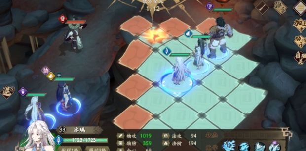 第4回合。冰璃正好吃到第2个buff 并获得再动,先到BOSS下面2格放幽剑,再通过天赋的再动近身放避实就虚。其余角色如图继续走位。这样就可以在第4阶段让冰璃攻击BOSS,之后冰璃将在第8回合和第12回合获得再动,确保最大化输出。敌动阶段,BOSS会后退1格对冰璃放技能,冰璃需要抗住。