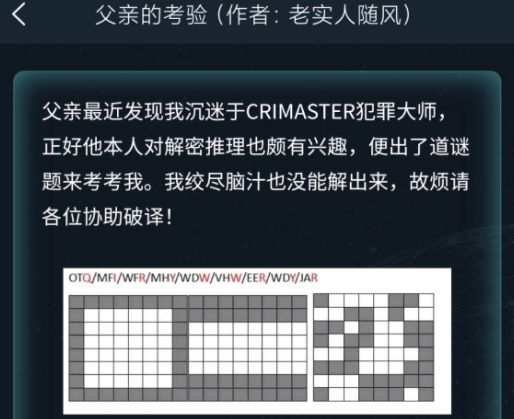 父亲最近发现我沉迷于CRIMASTER犯罪大师,正好他本人对解密推理也颇有兴趣,便出了道谜题来考考我。我绞尽脑汁也没能解出来,故烦请各位协助破译!