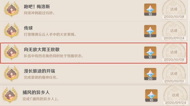 而且这个饱食度还可以触发一个成就,玩家们搜集一些普通的果子,然后给角色们吃,将队伍的四个角色的饱食度都吃到满的话,会解锁一个成就:向无敌大胃王致敬,解锁之后能获得十个原石,还没有解锁这个成就的玩家们可以前往完成了,除了这个玩家们在学习食谱和食物熟练度都达到一定的时候,也是能解锁两个成就的,这个可以在平时的日常当中完成,不得不说原神在成就这一方面设计的相当错,也是让玩家们感受到了不少快乐!